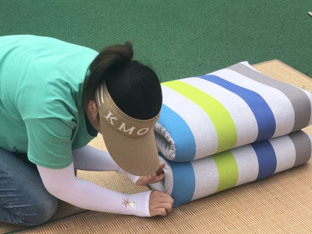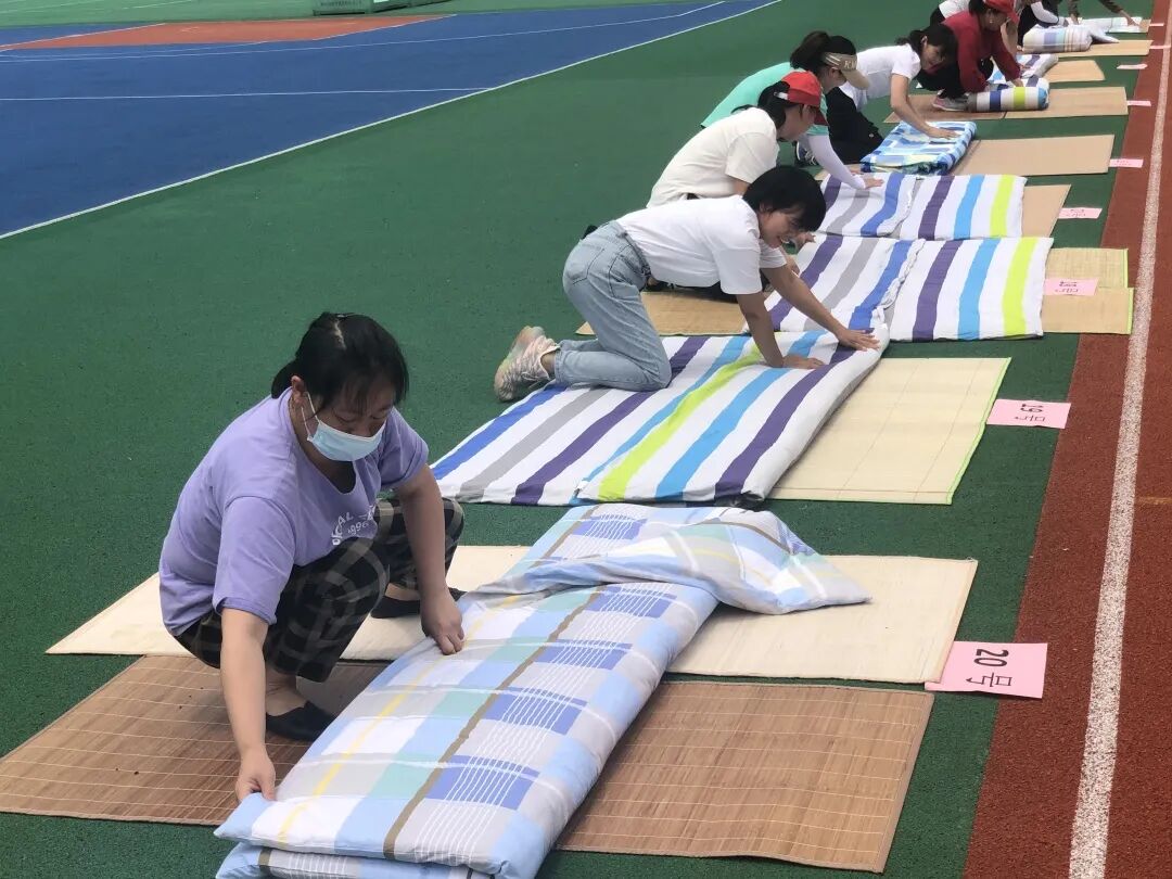 比赛开始前,参赛的生活老师将被子完全平摊在指定编号的地上,面向主席台站立。随着德育处副主任朱永林的一声令下,22位生活老师立即俯身开始折叠被子。