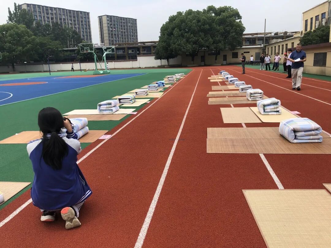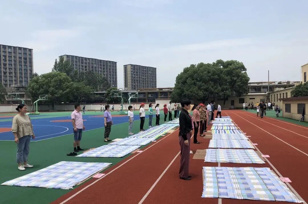 2021年5月25日12:20,久违的初夏艳阳高照大地,浙江义乌外国语学校塑胶操场上,生活老师叠被子比赛正在欢快地进行中。