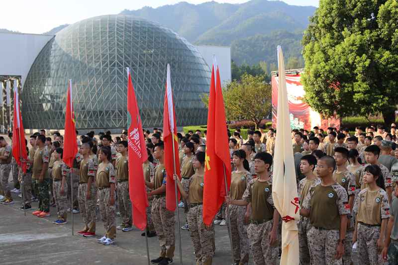 经过半个多小时的行程,来到了横店红军长征博览城,稍事休息,全体学员们列队集合,举行了庄严的升旗仪式。在鲜艳的国旗下,同学们在教官的带领下做手语操——《国家》,家是最小国,国是千万家。